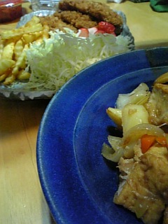 野菜と厚揚げの煮物と一緒にいただきます(^^)じゃがいも、にんじん、玉ねぎetc…この玉ねぎとじゃがいもが、いい味を出してくれるんですよね〜煮物は、やっぱり美味しい。日本人に生まれてよかった(^0^)/